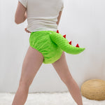 - Easy Adding/Removal Five Plastic Button-snap Dino Tail, located at the Tail Bone of the Cloth Diaper.