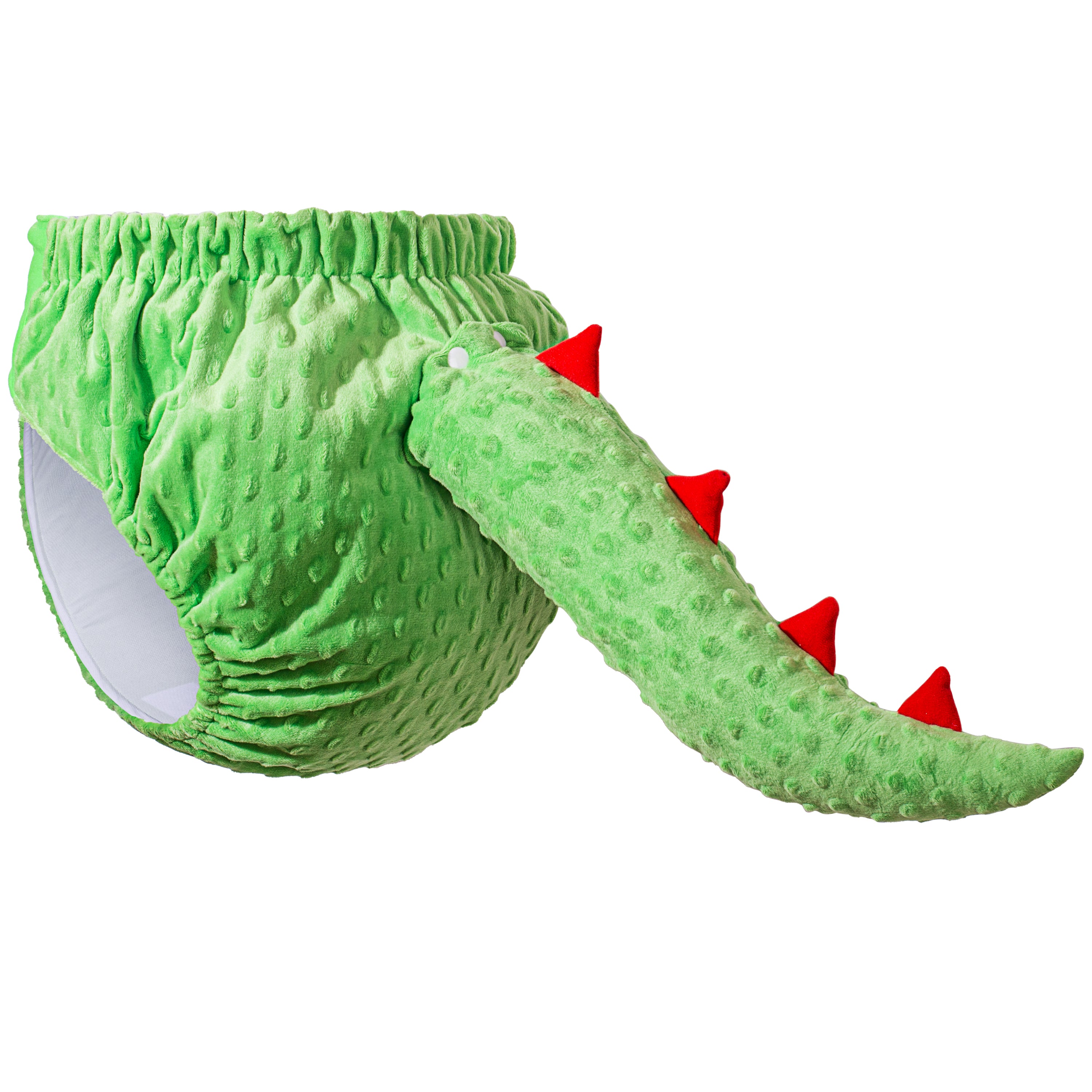 - Easy Adding/Removal Five Plastic Button-snap Dino Tail, located at the Tail Bone of the Cloth Diaper.