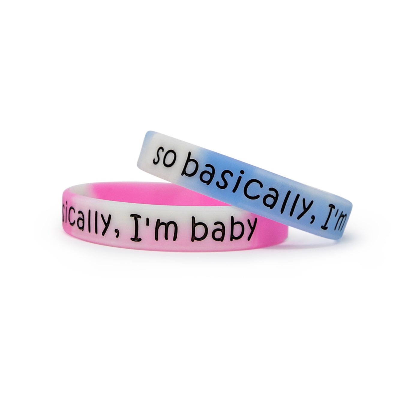 - “so basically, I’m baby” Wristband with two tye-dye colors Pink + White and Blue + White (Both comes in the pack) Glow in dark (Green)
